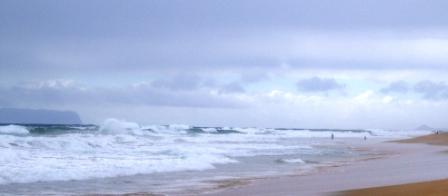 The picture on the right shows some intrepid swimmers and surfers; there was a high surf warning yesterday. In the distance on the left is the high cliff of Ni’ihau, the Forbidden Island, which is not open to visitors except on a limited basis. It’s inhabited by about 130 full-blooded Hawaiians and is about 17 miles off the coast of Kauai. The island was sold by King Kamehameha IV in the 1860s to a Kauai resident, whose ancestors still own and operate the island. Hawaiian is the language spoken.
