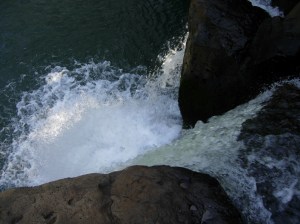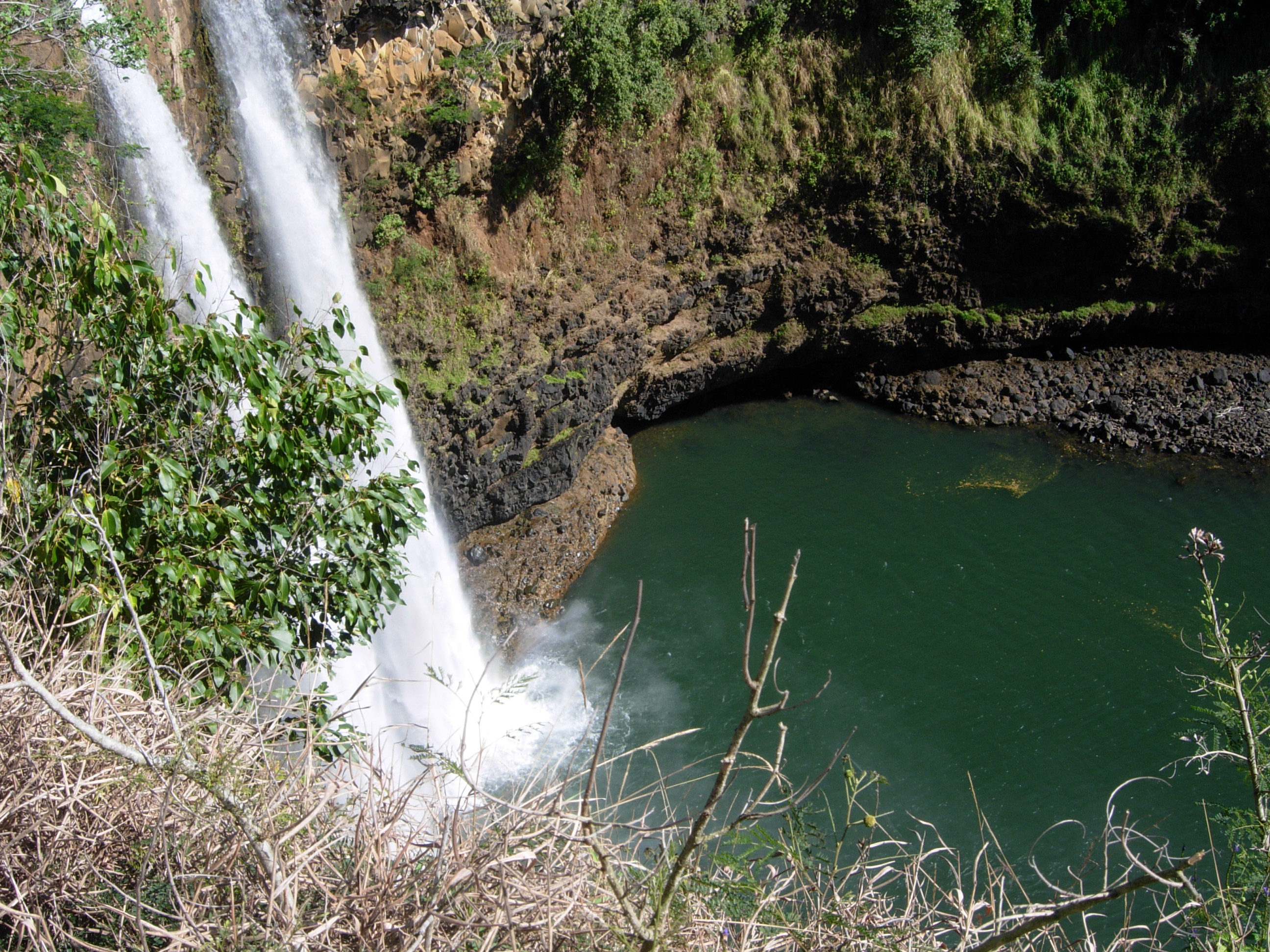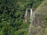 rushing waterfalls. Tammie drove me over to the west side of the island and we stopped at three waterfalls. The first, Opaeka’a (Opika), is a double falls that’s about 150 feet high, with the Makaleha Mountains in the background. The next one we went to was Wailua Falls, also in Kihue, another double waterfall, this one about 170 feet high. It crashes into a deep turquoise pool. The story is that in ancient times Hawaiian men would jump from the top to prove their manhood.