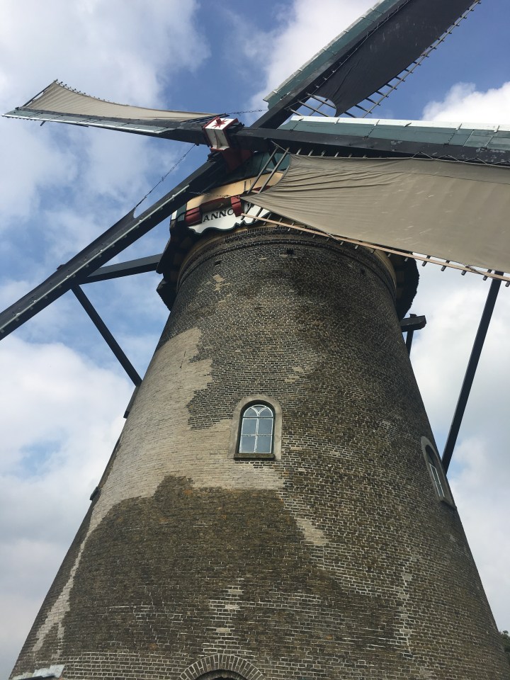 The sails themselves are massive. It was a bit disconcerting to walk around when the sails were in motion. The sound is incredible. These mills with very long sails are called grondzeilers or “ground sail windmills” because they almost touch the ground. The whole upper section of the mill can be turned by a manual crank inside; this is known as “winding.” Helpful when the wind changes directions! Some of the mills are in a straight line on the canal (but have more space between them); some are staggered (and closer together) to ensure the sails catch the wind. Two of the mills are octagonal. I’d thought these were the newest of the group, but they’re actually among the oldest. Eight of the mills are brick (built in 1738), eight are thatched (built in 1740), two are stone (b