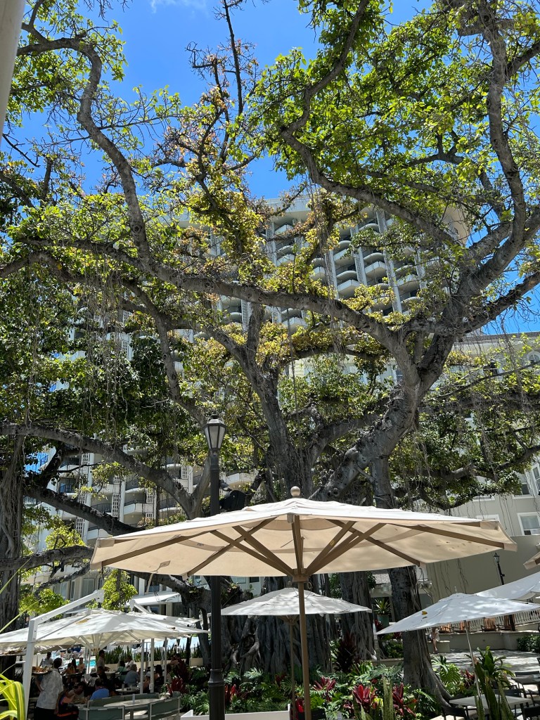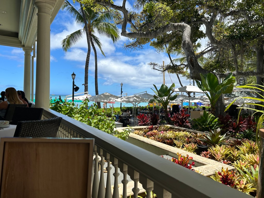 Anyway, off I went to the Veranda. It’s a beautiful, wise porch area with room for about 20 tables of varying sizes. Mine was a two-seater right next to the railing overlooking the hotel’s famous Banyan tree and, a little further along, Waikiki Beach.