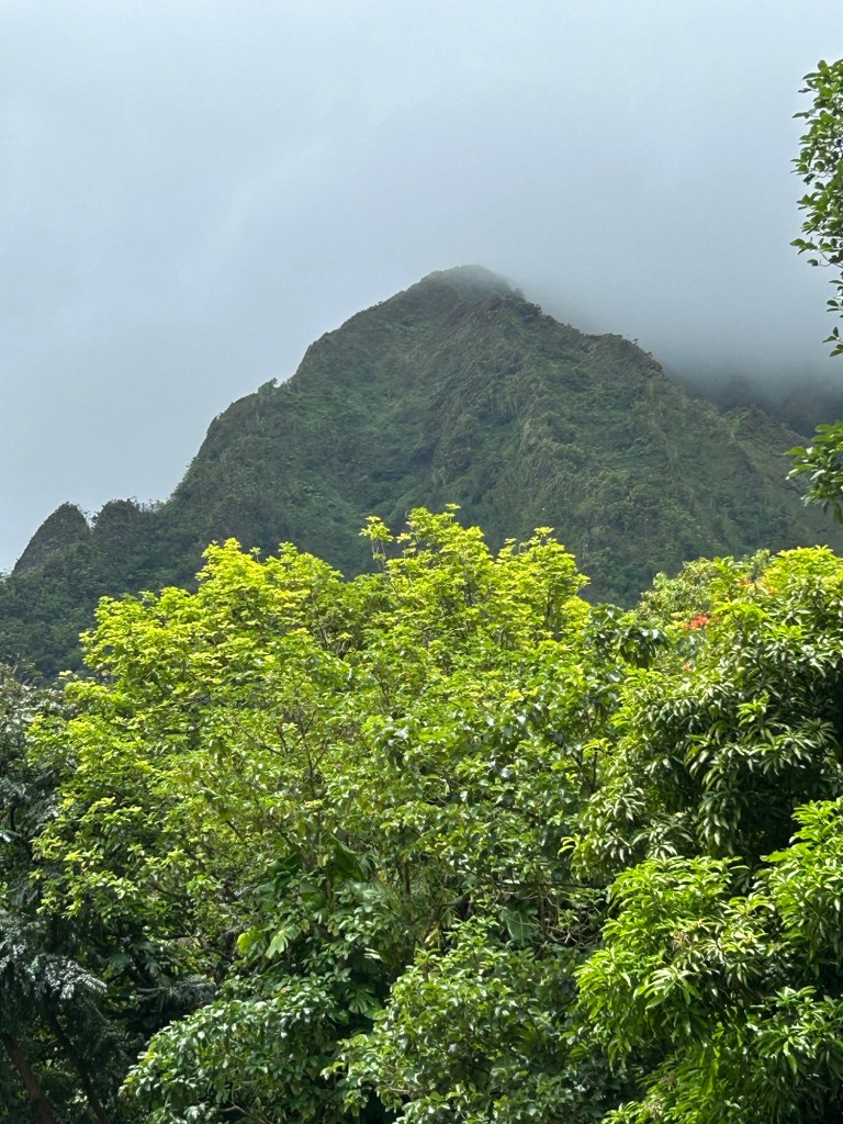 From the lighthouse trail, which is on the southeast shore of Oahu, I went north and inland to the Byodo-in Temple (https://byodo-in.com/) in Kaneohe. It’s set at the feet of the Ko’olau Mountains, which are lush and sharp at the tops. And today they were topped by mist.
